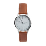The limited edition 30mm silver and grey dial women's watch with light brown tan leather strap combines the classic detailing of vintage watches with a modern minimalist finish.