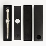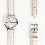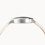 As seen in WONDERLAND MAGAZINE, the limited edition 30mm silver and cream/nude women's watch combines the classic detailing of vintage watches with a modern minimalist finish.